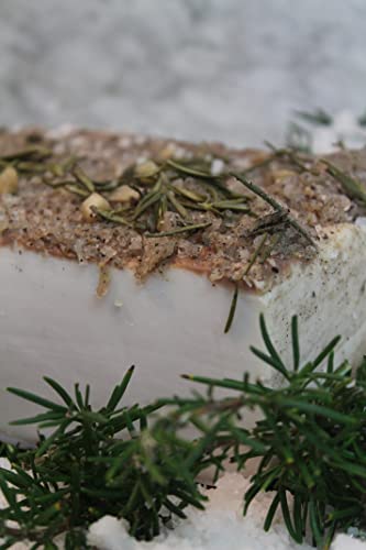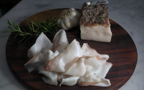⭐ Sapore e Aspetto Unici: Il lardo si presenta bianco quasi rosato, con una copertura di sale marino grigio-nero e uno spessore del pezzo che varia da 4 cm a 8 cm circa.