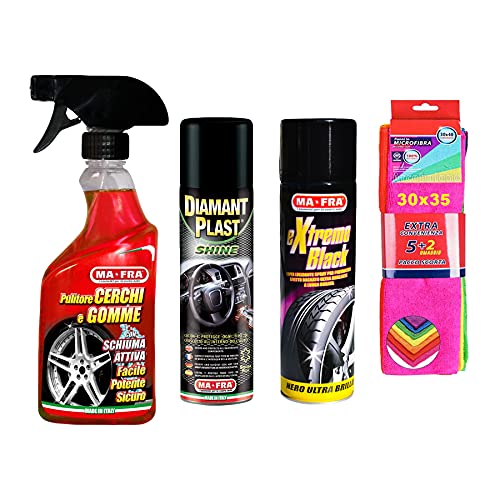 Set MAFRA pulitore cerchi e gomme, diamant plast shine, extreme black più confezione di 7 panni in microfibra 30x35 cm