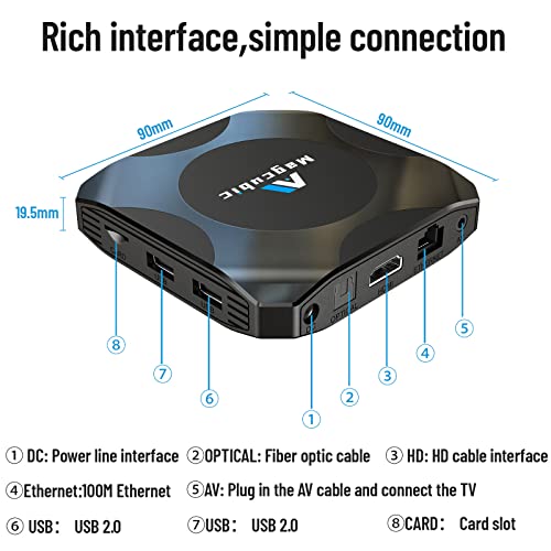✅[Eccellente connettività] Questo box TV Android è dotato di IEEE 802.11 a/b/g/n/ac 2.4G/5G WIFI, Bluetooth 5.2 e 100M Ethernet, fornendo una connessione più stabile e un'eccellente velocità. Inoltre è dotato di una porta per slot USB/Micro SD, è comunque possibile collegare dispositivi esterni. Inoltre, il dispositivo è molto facile da installare e utilizzare, basta collegare l'alimentazione, collegare il decoder via cavo HDMI e Wi-Fi/Ethernet e puoi usarlo.