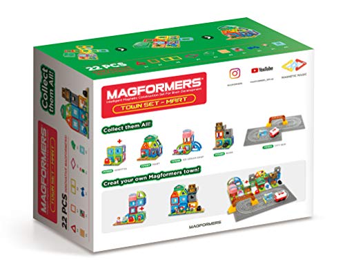 In questo super set di giocattoli magnetici da 22 pezzi troverete 14 forme magnetiche Magformers, sette accessori in stile supermercato e un negoziante.