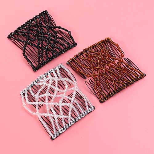 3pcs Magic Combs Hair Bun Maker Accessories Elastic Beaded Double Hair Clips Combs Hair Styling Tool for Woman (White, Black, Coffee)