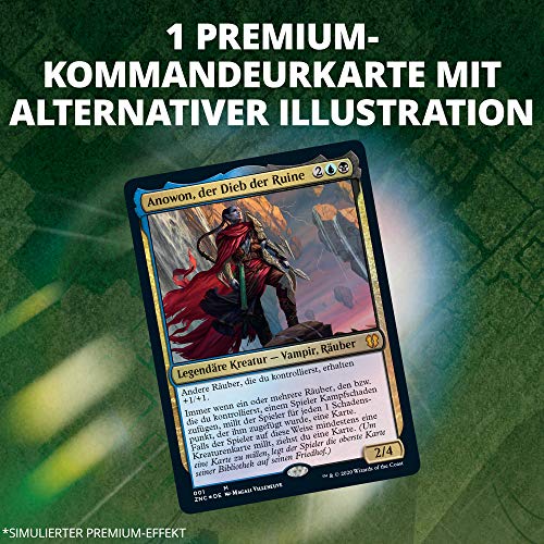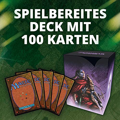 Contenuto della confezione: 1 mazzo pronto per giocare con 99 magic: carte The Gathering, 1 scheda di comando Premium con illustrazione alternativa, 10 mattoncini di gioco, 1 scheda di riferimento, 1 scatola di copertura (con spazio per 100 carte con buste), 1 contatore per punti di vita.