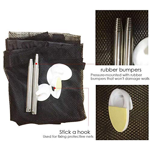 Realizzato in rete di nylon di alta qualità, due aste elastiche e quattro ganci adesivi, montaggio rapido e facile, nessun attrezzo richiesto, è molto facile da installare ovunque