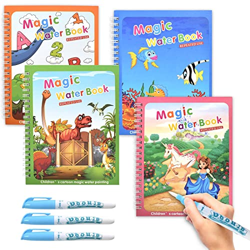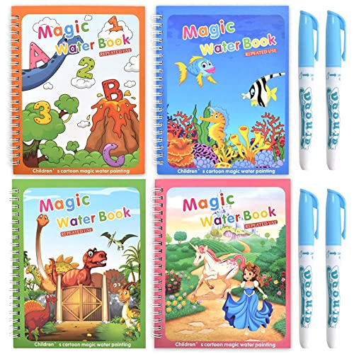 Magic Water Drawing Book 4 PCS Libro di Pittura ad Acqua Magica Riutilizzabili per Bambini con Penna ad Acqua Giocattolo Educativo per Dipingere Scarabocchi Regalo per Ragazzi Ragazze Oltre 2 Anni