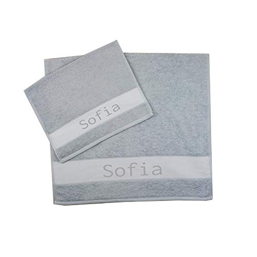 MAGIE DI CASA Asciugamani PERSONALIZZATI CON NOME, Set 2 Pezzi Spugna da Bagno Spugna, Viso + Ospite Cotone 100% Made in Italy (GRIGIO, NOME)