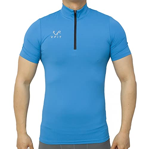 Vf VFIT Maglietta Compressione Uomo Manica Corta con Cerniera Sportiva Fitness (L, Blu)