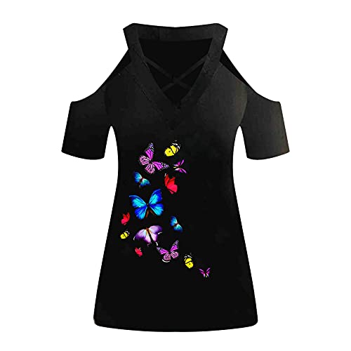 Maglietta da donna con scollo a V, camicetta senza spalle con girasole, crisantema, farfalla stampata, spalle scoperte, maniche corte, scollo a V multicolore L
