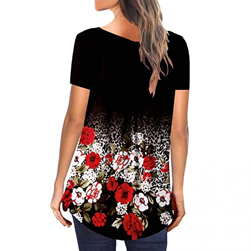 Maglietta estiva da donna, a maniche corte, casual, casual, con bottoni, basic, scollo rotondo, camicetta con stampa floreale, E-rosso, XL
