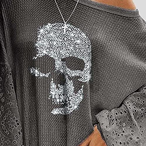 Maglietta a maniche lunghe da donna, a maniche lunghe, con strass, con stampa a teschio, elegante, scollo rotondo, per ragazze, casual, a maniche lunghe, grigio., XXL