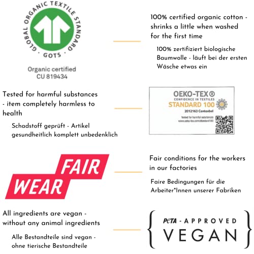 COTONE BIOLOGICO - Le nostre t-shirt sono realizzate con il 100% di cotone biologico coltivato in modo sostenibile, i nostri produttori sono certificati: Fair Wear, GOTS e OEKO-TEX 100. Per la coltivazione, viene utilizzato il compost al posto dei fertilizzanti sintetici, il controllo biologico dei parassiti al posto dei pesticidi e le piante geneticamente non modificate. Naturalmente vegano, il morbido cotone e taglio trasmettono una sensazione di comfort.