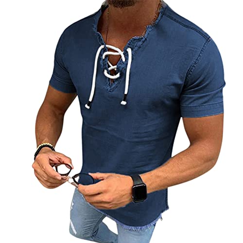 Maglietta oversize da uomo, a maniche corte, con collo a V, da uomo, con nappa, in denim, tinta unita, da uomo, Blu scuro, L