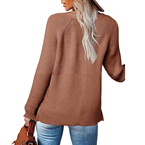 Maglione Donna Allentato a Maniche Lunghe Maglieria con Scollo a V Bottoni Finti Tinta Unita Maglietta a Maglia Autunnale Top Casual Pullover Semplice Classico Ufficio (caffè, S)