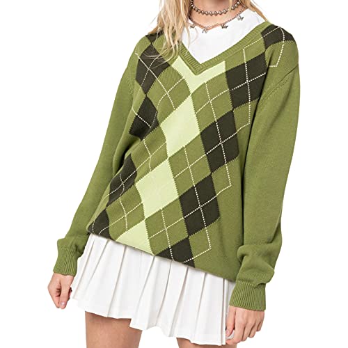 Maglione Donna a Rombi Pullover Maglieria Scollo a V Maniche Lunghe con Motivo Geometrico Casual Adulti Top a Maglia Classico Caldo Oversize Sweatshirt AutunnaleUfficio (Verde, M)