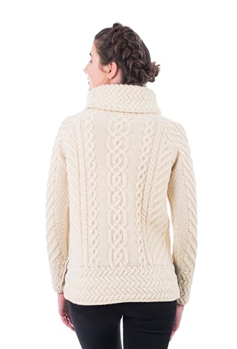 SAOL - Maglione 100% lana merino Fisherman, collo a imbuto Irish Aran, da donna, colore grigio e verde, naturale, XL