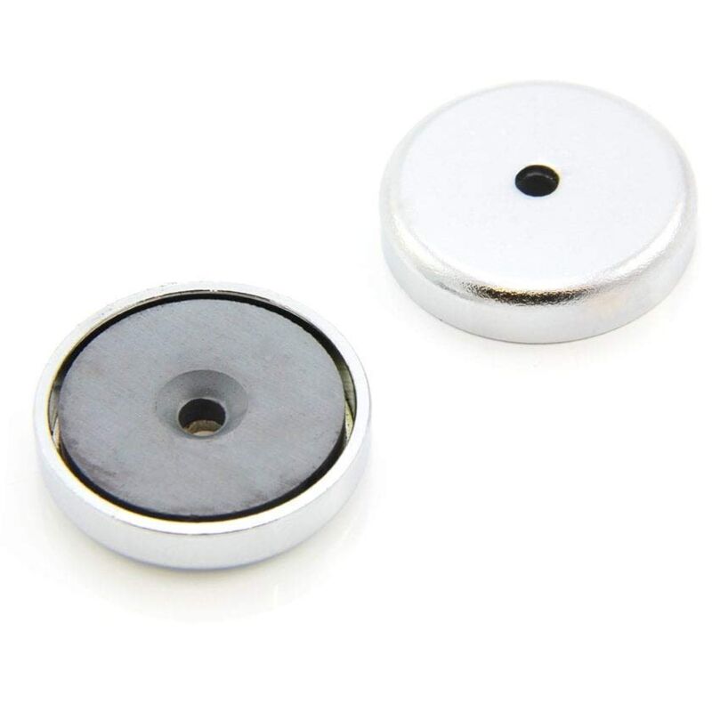 Confezione da 1 40 mm di diametro x 8 mm di spessore con foro svasato di 5 mm di diametro per il fissaggio. Ogni magnete è magnetico solo sulla faccia svasata Ogni magnete può supportare 15 kg di trazione verticalmente dalla faccia magnetica quando è a contatto con una superficie in acciaio dolce di uguale spessore Scocca in acciaio cromato Può essere fissato in posizione con viti svasate di diametro 5 mm. Ottimo rapporto qualità-prezzo, questi magneti in ferrite sono realizzati con un magnete in ferrite incassato in un guscio in acciaio, il che significa che il polo nord si trova al centro della faccia magnetica e il polo sud è sul bordo esterno intorno ad esso. Il vaso in acciaio aumenta la forza adesiva dei magneti dando loro una forte tenuta per le loro dimensioni. Un ulteriore vantaggio dei magneti del vaso è che sono resistenti a scheggiature o screpolature a seguito di un impatto costante con una superficie d'acciaio.