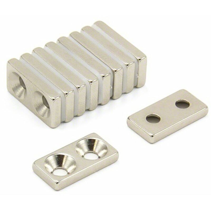 Confezione da 10. 20 x 10 x 3 mm, con diametro di 3,5 mm e fori sfasati per fissaggio. Magnete dotato di polarità sud sulla faccia svasata. Rivestiti con 3 strati di nichel, rame e nichel per prevenire eventuale corrosione. Fissabile con 2 viti coniche svasate.