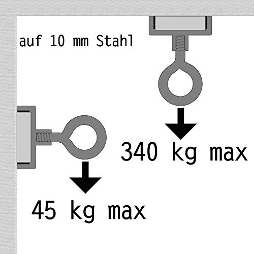 340 kg di forza adesiva su trazione e superficie adatta grazie al nucleo in neodimio NdFeB N35 con occhiello svitabile nella filettatura M10