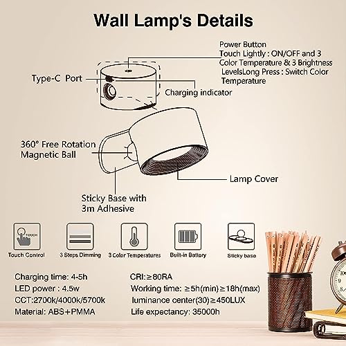 [360°Rotating Light & Memory Function]-The LED wall sconces have a magnetic ball that allows for 360° rotation, giving you the ability to rotate the light source in any direction. Additionally, the compact desk lamp has a memory function that saves your previous mode and brightness settings for added convenience the next time you use it.