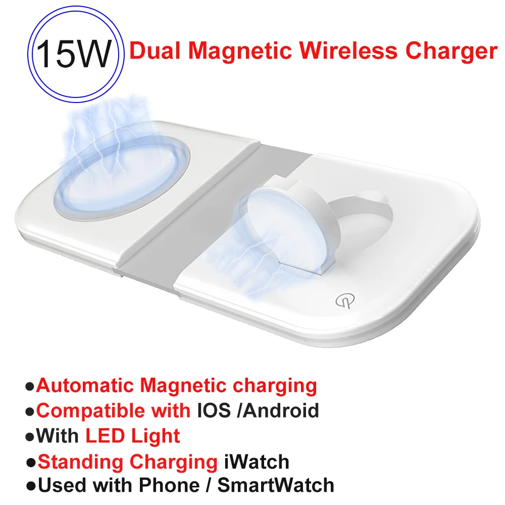 15W Magsafe Duo Charger Pad with Led Light For iPhone 8/11/12 Magnetic Dual Folding Qi Wireless Charger Stand For iWatch Airpods
