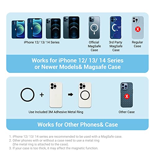 Ampia compatibilità: il supporto magnetico per treppiede per telefono è compatibile con iPhone 15, 14, 13, 12 Pro Max Plus e custodia MagSafe, o utilizza l'anello magnetico incluso per iPhone 11 X XR XS 8 7 e telefoni Android.