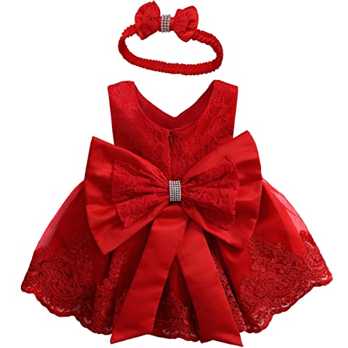 MAHUAOYIXI 2 Pezzi Vestito da Neonata Senza Maniche con Scollo Rotondo in Pizzo Floreale con Fascia Tutu Gonna Bambina Principessa Elegante Battesimo Casual Abito Sposa (Rosso, 18-24 Mesi)