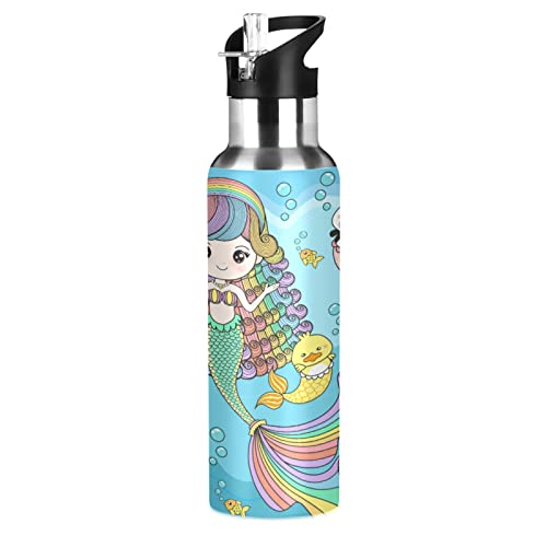 Maiale Gatto Sirena Arcobaleno Borraccia Termica con Cannuccia Sportiva, Bottiglia Acqua in Acciaio Inox Isolato 600ML Senza BPA per Bevande Calde e Fredde per Bambini Scuola