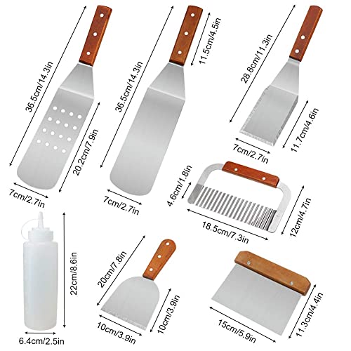 【9 Set di strumenti Teppanyaki】 2 spatole in acciaio inossidabile di tipo professionale di grandi dimensioni e 1 girarrosto per hamburger più grande di livello professionale. 2 chopper / raschiatori in acciaio inossidabile. 3 bottiglie da 8 once / 250 ml. 1 utensile da taglio ondulato per tagliare la patata.