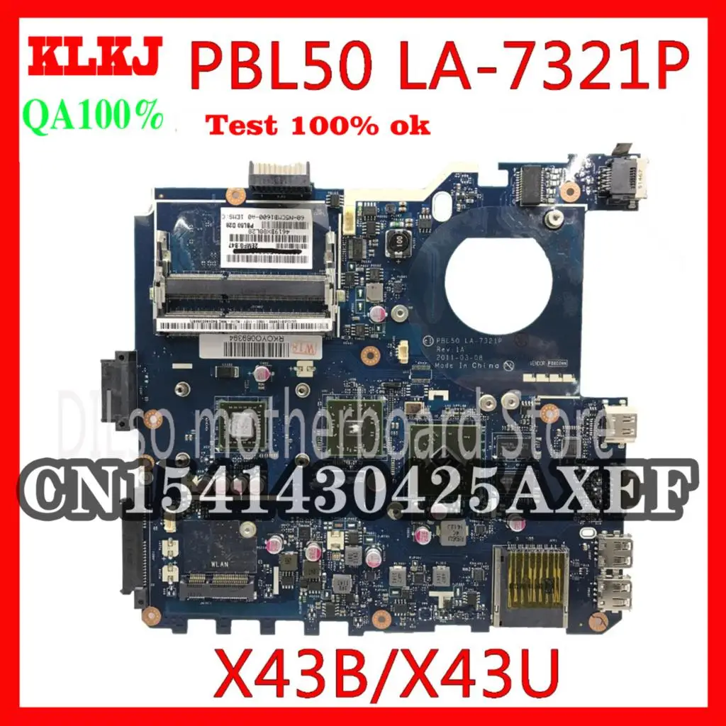 KLKJ K43B Mainboard For ASUS X43U K43U X43B K43BY K43BR X43BR Laptop Motherboard PBL50 LA-7321P With CPU 100% Original
