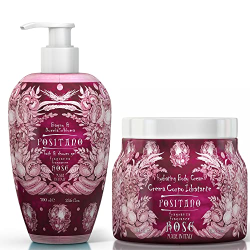 Le Maioliche - POSITANO ROSE - BAGNO DOCCIA 700 ml + CREMA CORPO 450 ml - MADE IN ITALY - Note di Petali di rosa, Geranio, Violetta, Garofano + OMAGGIO 2 Tisane Funzionali Viropa