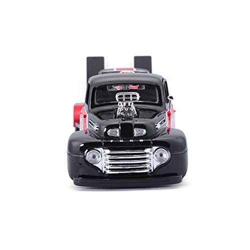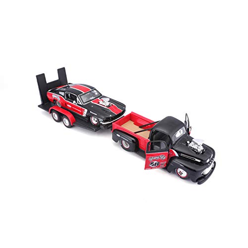 Maisto Design Elite Transporter Ford F1 Pickup (1948) + Ford Mustang GT (1967): trasportatore con rimorchio, 2 modellini auto, porte apribili, scala 1:24, 43 cm, rosso/nero (532751)