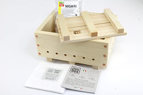 IL KIT INCLUDE: La pressa per tofu (cm 23x17x9.5), una mussola 100% cotone (cm 45x45), istruzioni (italiano e inglese), e 100g di nigari per produrre oltre 5Kg di tofu!