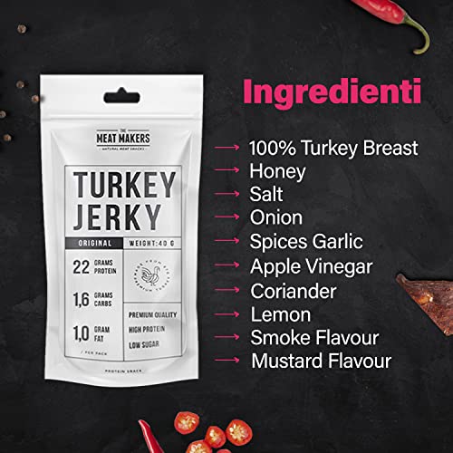 THE MEAT MAKERS 100% Turkey Jerky 7x40g Sostituto del frullato proteico ideale per l'ufficio, vita attiva, post allenamento. Carne Essiccata Snack Proteici, Jerky Chips, Carne Secca