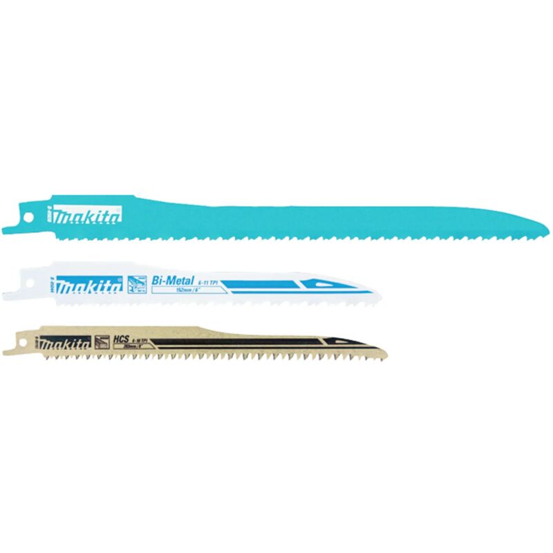 Set di 3 lame Super Express Makita B-13677 . SPECIFICHE TECNICHE Lama B-05038 denti fresati ondulati BIM lunghezza 152mm denti per pollice 7-18 lama universale bimetallica per lamiere 1-8mm, profili 5-100mm Lama B-05044 denti fresati ondulati BIM lunghezza 152mm denti per pollice 6-11 per legno chiodato, lamiere, plastica, fibre di vetro Lama B-05153 denti smerigliati aperti HCS lunghezza 203mm denti per pollice 6-10 per plastica 6-150mm, legno, legno da costruzione 6-150mm, truciolato