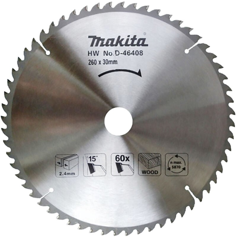 La lama TCT per troncatrici 260x30 mm per legno Makita D-46408 è un accessorio da taglio professionale per elettroutensili da banco.Questa lama risulta particolarmente resistente ed efficiente, indicata per realizzare tagli puliti nel legno grazie ai suoi 60 denti.Compatibile con differenti modelli di utensili grazie al diametro da 260 mm ed all'attacco a foro da 30 mm.Le immagini sono illustrative e potrebbero non rappresentare fedelmente il prodotto finale. Tipologia: Lama per troncatrice Tipo di lama: Standard Diametro: 260 mm Foro: 30 mm Spessore dente: 2,4 mm Angolazione dente: 15° Spessore anima lama: 1,8 mm Velocità massima: 5870 giri/min Tipo di materiale: Tungsteno Tipo di macchina: Troncatrici N. di denti: 60 Pezzi per confezione: 1 Utilizzo: Legno Dimensioni: 260x30 mm