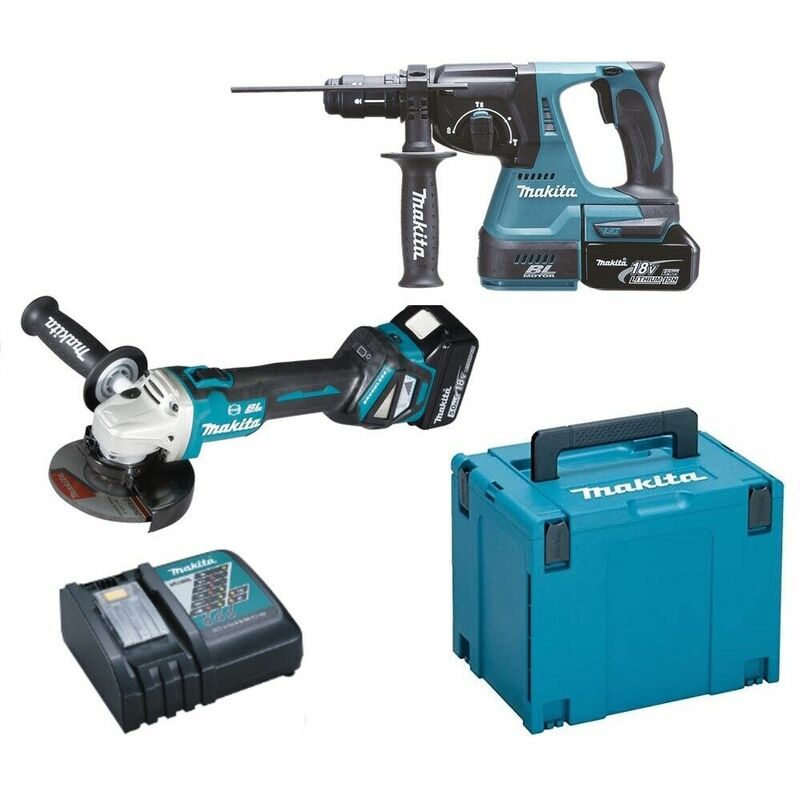 Combo Kit DGA513 + DHR243 COMBO KIT 18V composto da: DGA513 smerigliatrice angolare Ø125 + DHR243 tassellatore sds plus In dotazione • Smerigliatrice DGA513 • Tassellatore DHR243 • 1 Caricabatteria DC18RC • 2 Batterie 5 Ah • 1 Valigette Makpac tipo 4 Dati Tecnici DHR243 • Tensione nominale della batteria: 18 V • Potenza del colpo: 2,0 J • Diametro max foro in calcestruzzo: 24 mm • Diametro max foro in legno: 27 mm • Diametro max foro in acciaio: 13 mm • Impulsi al minuto: 0 - 4700 min⁻¹ • Velocità a vuoto: 0 - 950 min⁻¹ • Livello potenza sonora: 100 dB(A) • Livello pressione sonora: 89 dB(A) • Livello di vibrazione (3 assi), foratura: 2,5 m/s² • Vibrazione scalpellatura: 11 m/s² • Incertezza di vibrazione (fattore K): 1,5 m/s² DGA513 • Velocità a vuoto: 3000 - 8500 min⁻¹ • Massima profondità di taglio: 29 mm • Diametro del foro (diametro dell'albero): 22,23 mm • Diametro disco abrasivo: 125 mm • Livello pressione sonora: 79 dB(A) • Incertezza del rumore (fattore K): 3 dB(A) • Livello