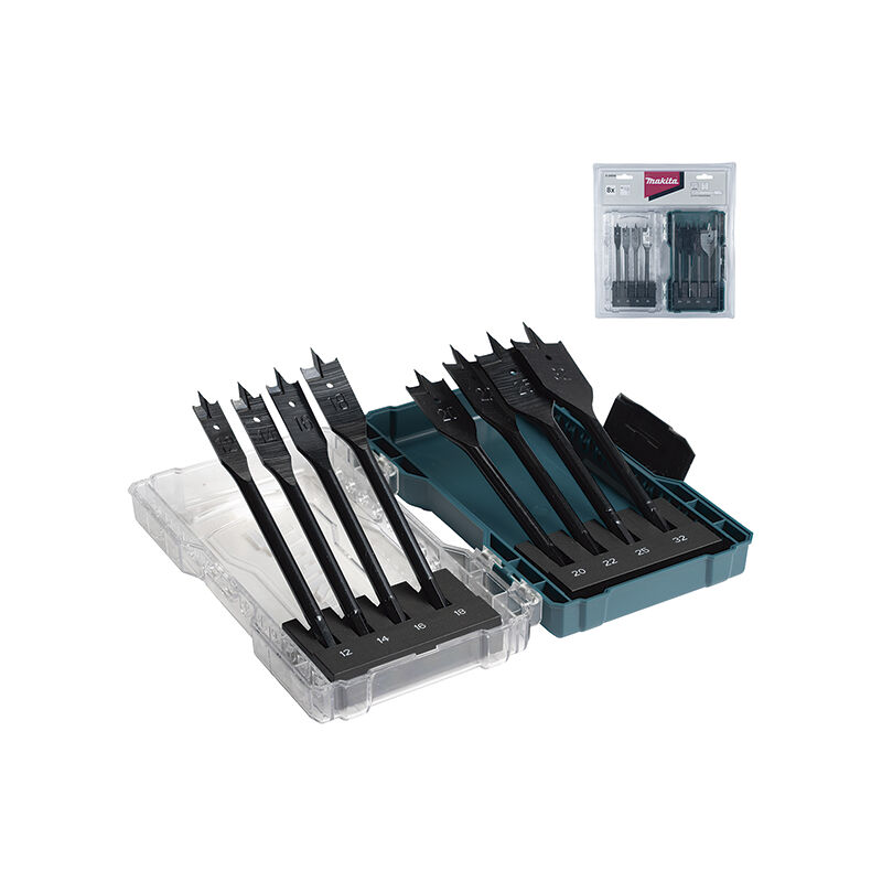 MAKITA E-08698 Set di punte a vanga per legno, 8 pezzi. Custodia in plastica con 8 punte a vanga per legno. Vantaggi per l'utente 8 punte con gambo esagonale da 1/4". Composto da punte da trapano, giradadi, per vari compiti. Le punte da trapano sono 12, 14, 16, 18, 22, 25, 32 mm. Per falegnami, mobili, manutenzione di apparecchiature elettriche. Specifiche Descrizione - Per legno - Diametro - 12, 14, 16, 18, 20, 22, 25, 32 - mm Lunghezza totale - 160 - mm Unità - 8