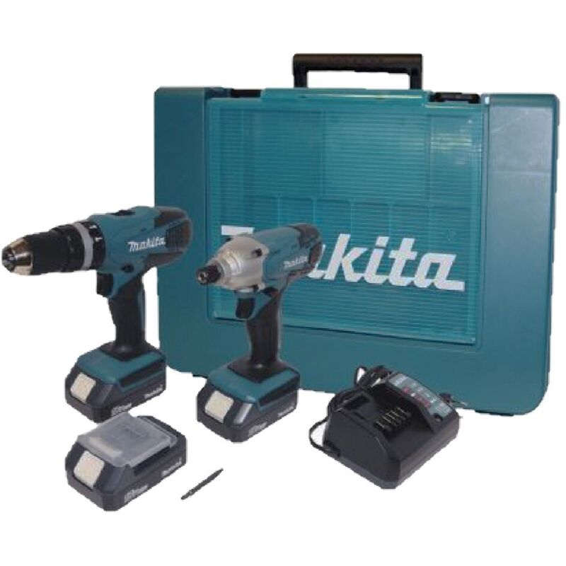 In comoda valigetta. Trapano avvitatore con percussione HP488D: 18V, tempo di ricarica 60 minuti, capacità massima foratura legno 36 mm, acciaio 13 mm e mattone 13 mm. Velocità a vuoto 0-400 e 0-1400 giri/min. A 2 giri meccanici, mandrino 13 mm, controllo variabile velocita. Peso 1,8 kg. Trapano avvitatore a massa battente TD127D: 18V, tempo di ricarica 60 minuti, capacità viti standard 4-8 mm, bulloni 5-14 mm, bulloni in tensione 5-12 mm, percussioni 3000 colpi/min. Controllo variabile velocità, illuminazione led. In dotazione 3 batterie Li-ion 2 Ah 18V (BL1820G), caricabatteria.. assemblato 2 pezzi. Prezzo inteso per: 1 PZ