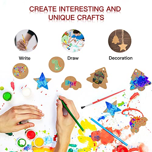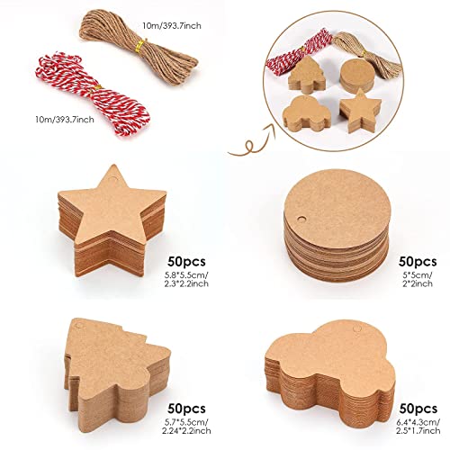 ●Carta kraft fornisce 4 forme: cerchi classici, stelle romantiche, auto carine e bellissimi alberi di Natale (vedi la figura per le dimensioni specifiche), con 1 rotolo di corda di iuta da 10 m e 1 rotolo di corda di cotone rossa da 10 m, che può essere tagliato alla lunghezza richiesta