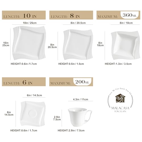 MALACASA, Serie Amparo, 30 Pezzi in Porcellana da Tavola Set con 6 Piatti da Dessert/ 6 Tazze di caffè/ 6 Piattini/ 6 Piatti Fondi/ 6 Piatti Piani/per 6 Persone Colore Bianco