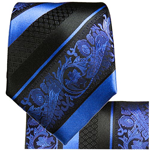 Paul Malone Cravatta di seta + fazzoletto a strisce blu barocco nero (extra lungo 165 cm)