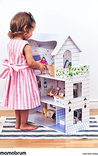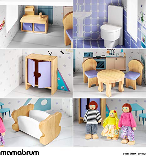 Mamabrum Casa delle Bambole in Legno Grande, Casa delle Bambole con 3 Livelli, 5 Pezzi, 3 Bambole, Mobili e Accessori Inclusi, Vernice Ecologica, Giocattoli per Bambini da 3 Anni