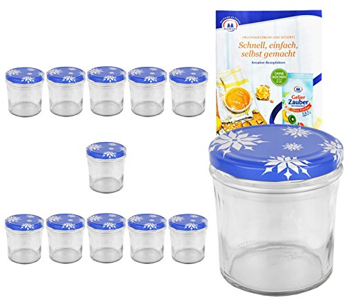 MamboCat Set di 12 vasetti in vetro da 350 ml a 82 coperchi con fiocchi di neve incl. libro di ricette per marmellate e conserve