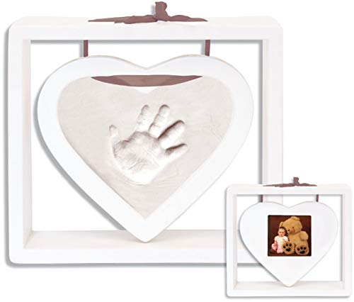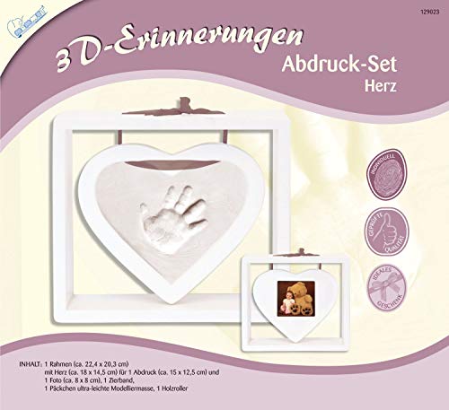 Il set completo include 1 cornice (circa 22 x 20 cm) con cuore (circa 18 x 15 cm) per 1 impronta (circa 15 x 13 cm) e 1 foto (circa 8 x 8 cm), 1 nastro decorativo, 1 pacchetto di pasta modellabile, 1 rullo in legno