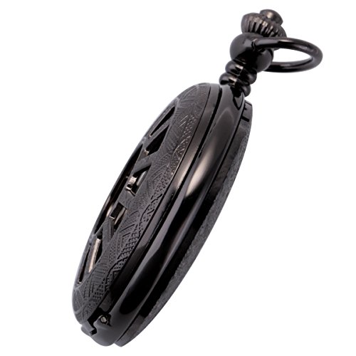 1. Speciale design - elegante metà cacciatore. Vedere il tempo direttamente attraverso la custodia cava e permettendo una visione globale di ingranaggi. Speciale quadrante nero e oro movimento orologio da tasca con antico forma. vintage e alla moda.