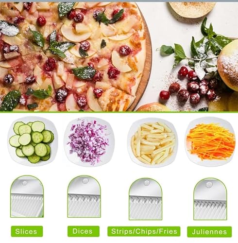 ✅ VERSATILE: Tagliare le verdure in splendide guarnizioni è ora facile come premere una maniglia. Con 4 diverse modalità di taglio (Affetta, Striscia, Julienne, Dadi) e 40 spessori di taglio variabili (da 0,5 mm a 8 mm) facilmente regolabili tramite le manopole di controllo, è possibile creare 160 stili di taglio. Non solo un'affettatrice a mandolina, ma anche una cubettatrice, un tritatutto, una taglierina, un'affettatrice a julienne e uno sminuzzatore di patate.