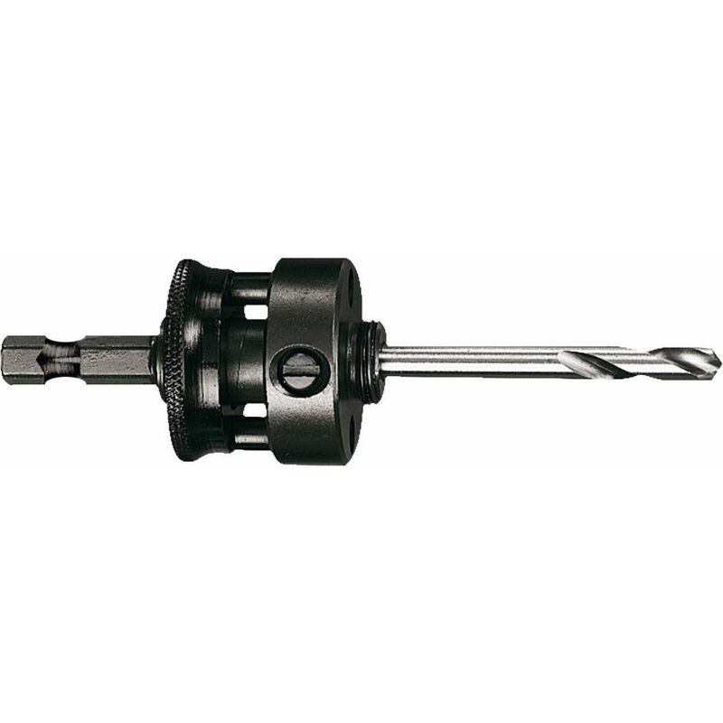 Mandrino completo di punta pilota in acciaio HSS tipo A014C. La misura del codolo esagonale da 8,75 mm. E' filettato da 5/8-18F e utilizzabile sulle seghe a tazza dal diametro 32 al diametro 210 mm. Esecuzione con ghiera di trascinamento a scatto.