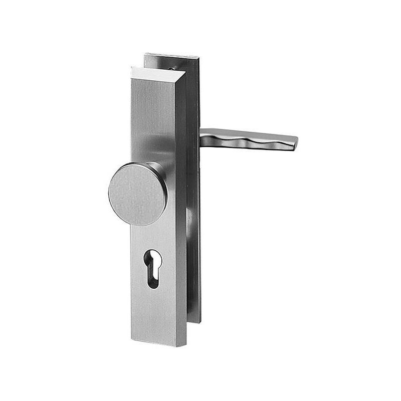 Set di cambio protezione per porte di ambienti Rondo - In alluminio. color argento. anodizzato. quadrato - Direzione DIN sinistra-destra - Profilo cilindro forato. con coperchio. Distanza di perforazione 72 mm - Coperchio posteriore lungo. Spessore della rosetta - Conservazione sciolta - Con pomolo K7. fissato sulla rosetta. rotondo. Larghezza 52 mm. Lunghezza 240 mm. Altezza 41 mm. Diametro 55 mm - Collegamento a perno. avvitato a scomparsa. con camme di supporto - Direzione di arresto della maniglia utilizzabile per destra/sinistra. Perno di cambio fissaggio maniglia con rullo - Filettatura del rullo M12 - Classe di resistenza ES 0 (SK1) - Tipo di porta porte esterne. Materiale della porta: legno. Acciaio