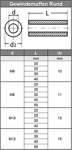 Manicotti filettati M10 X 40 rotondi, in acciaio inox A2 (10 pezzi) - Manicotti di collegamento per dadi lunghi distanziatori