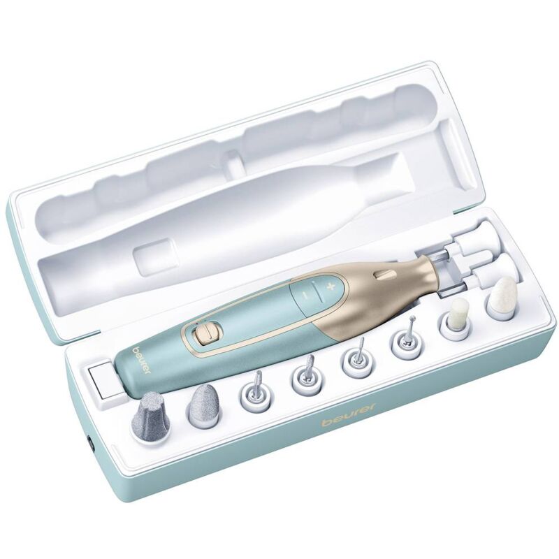 Dettagli tecnici Contenuto 1 pz. Dimensione del prodotto, larghezza 37 mm Dimensione del prodotto, lunghezza 155 mm Dimensioni (L x L x A) 155 x 37 x 38 mm Dimensioni prodotto Altezza 38 mm Peso 135 g Tipo prodotto Kit manicure e pedicure Capacità batteria agli ioni di litio: 1500 mAhTensione nominale: 3,7 VDimensioni della custodia: 223 x 74 x 67,5 mm Kit manicure/pedicure Beurer MP Per mani e piedi brillanti. Sia che si tratti di accorciare, limare, sagomare e lucidare i chiodi o rimuovere la cornea, la pelle del chiodo, i galleggianti e gli occhi di pollo - con i 10 accessori di alta qualità si ottiene una manicure o pedicure come da professionista. La pratica custodia funziona contemporaneamente come stazione di ricarica per il dispositivo di manicure ed è Ideal anche per i viaggi. Testo tradotto automaticamente Punti di forza e dettagli Pratica custodia di ricarica e conservazioneBatteria agli ioni di litio per 2 ore di utilizzo senza filiCon 10 accessori di alta qualità