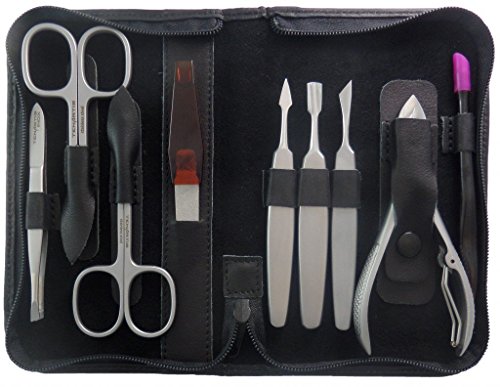 Contenuto: forbice pelli, forbice unghie, tronchese unghie piedi, pinzetta, limetta, quattro strumenti per la cura delle unghie e delle pelli